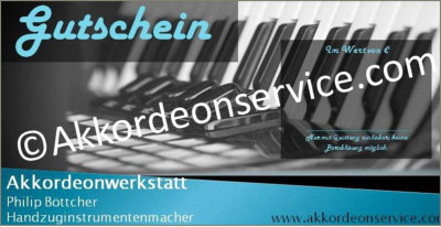 Sie sind auf der Suche nach dem perfekten Geschenk zu Weihnachten, Geburtstagen oder anderen Jubiläen? Ab sofort können Sie Gutscheine in verschiedenen Geldwerten erwerben und an Ihre Liebsten verschenken. Vorbestellungen nehme ich gern per Telefon oder E-Mail an, welche Sie unter Kontakt finden. Auch bei dem nächsten Akkordeonstand oder direkt in der Werkstatt ist es für die Last-Minute-Einkäufer möglich diesen kurzfristig zu erwerben.Ich freue mich auf Ihre Bestellungen!