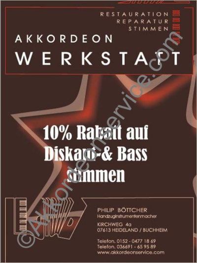 Zum 10 jährigen Bestehen gibt es nun 10% Rabatt auf das Stimmen von Akkordeons. Egal ob Piano- Akkordeon, Steirische Harmonika oder Conzertina. Falls Sie einen Gutschein in Ihrem Briefkasten vorfinden oder durchVerwandte, Freunde oder Bekannte erhalten, können Sie diesen jederzeit direkt einlösen.